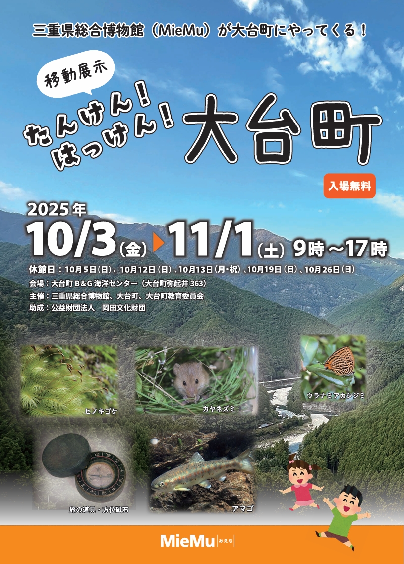 三重県総合博物館は、三重の多様な自然と歴史・文化を知っていただくため、県内各地で移動展示を実施しています。今回は大台町で、大台町に生息するツキノワグマやカヤネズミのはく製、昆虫や植物の乾燥標本など、当館所蔵の大台町周辺地域に関する資料を中心に展示するとともに、地域の自然や風習などについて調べた成果をあわせて紹介します。