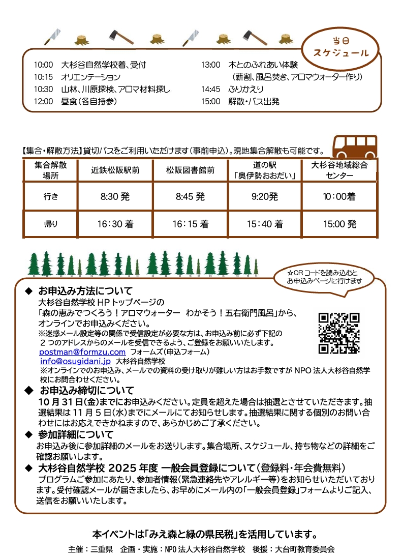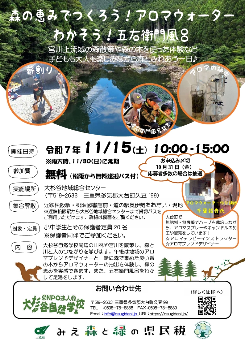 大杉谷自然学校「森の恵みでつくろう!アロマウォーター わかそう!五右衛門風呂」を開催します。