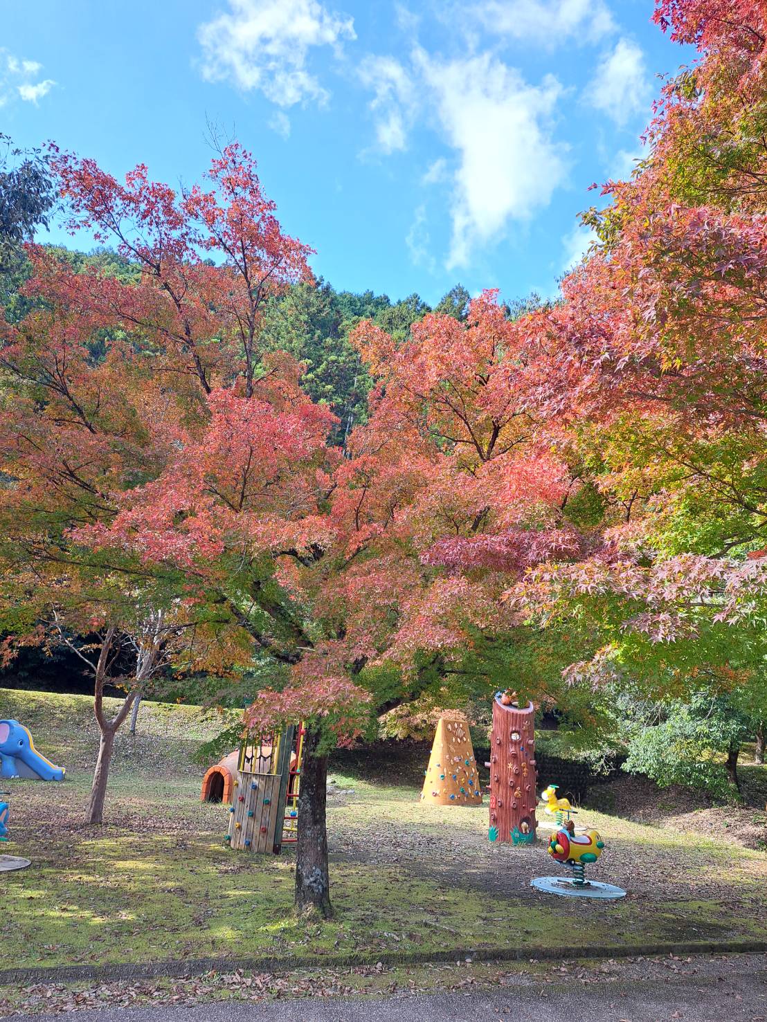 可愛い遊具を囲むように、色とりどりの木々が秋を知らせてくれています。