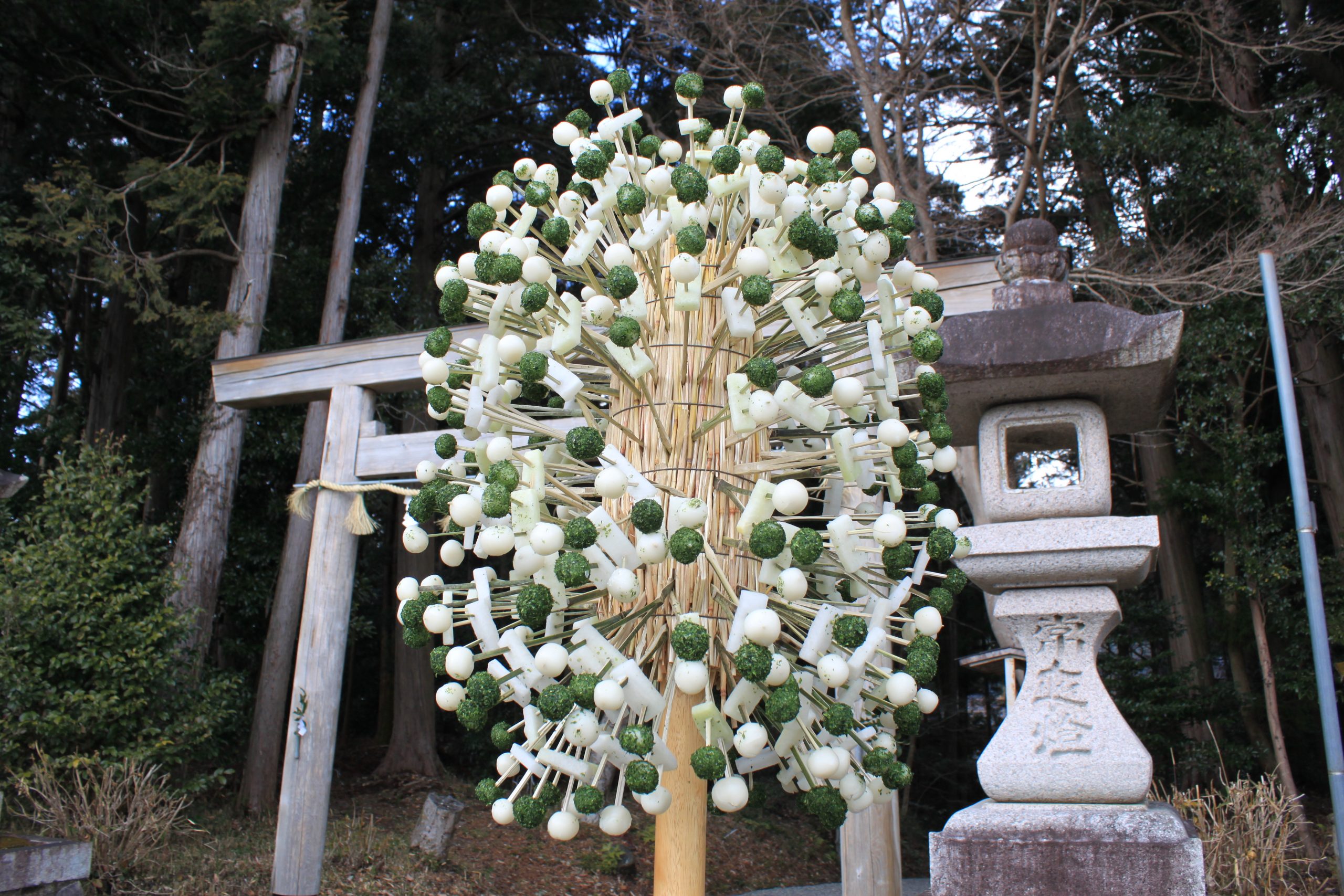 ひとつの串は、こんな感じ。餅2色と、下は大根。これを、麦わらで作った「ほで」に丸く刺してあります。